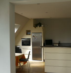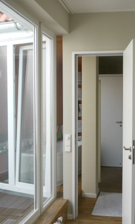 Kernsanierung ein ganz neues Gesicht. Aus engen, abgeschlossenen Räumen wurde durch Öffnungen und Verglasungen eine fließende Raumfolge, sowohl innen, als auch nach außen, von zurückhaltender Eleganz geschaffen. Eine Neuinterpretation der Raumdisposition führte zu offenem, sichtbaren Zusammenhängen der Räume, die das Gefühl einer