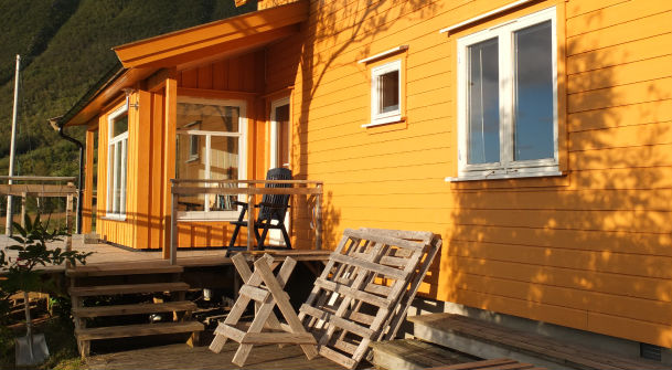 Das alte, kleine, fast quadratische, zweigeschossige Holzhaus, eine so genannte Hütte, wie sie jeder Nordnorweger hat, ist im Erdgeschoss um ungefähr die gleiche Grundfläche erweitert worden. Die Erweiterung bietet der größer gewordenen Familie mehr und besser nutzbare Wohnfläche.